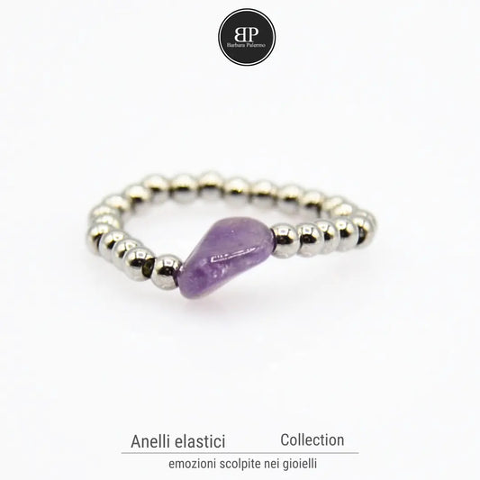 Anello Elastico con Ametista Irregolare e Sfere di Acciaio