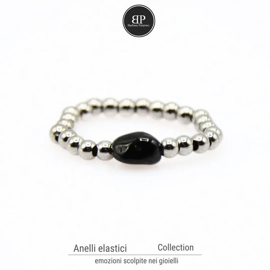 Anello Elastico con Onice Nero Irregolare e Acciaio
