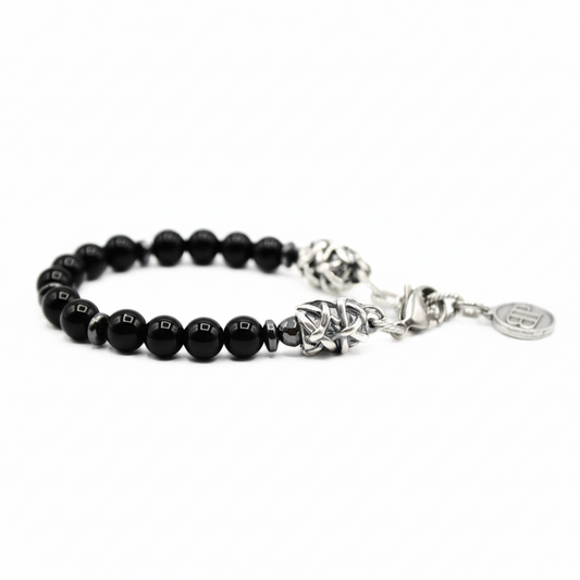 ESSENCE Herrenarmband aus schwarzem Onyx mit silbernen Anschlüssen