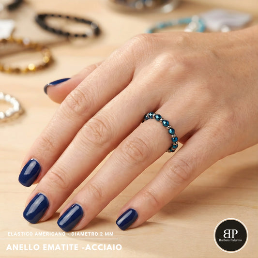 Elastischer Ring mit facettiertem, poliertem blauem Hämatit
