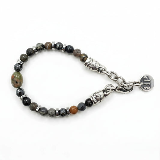 Für diese Natursteinarmbänder wurden die Metallminiaturen von Hand modelliert und mit der Goldschmiedetechnik des Mikrogusses undWachsausschmelzens mit doppelter Versilberung nachgebildet und von Hand antikisiert und gebürstet. Die Karabiner und Ketten bestehen zu 100 % aus hypoallergenem Chirurgenstahl 316 L.