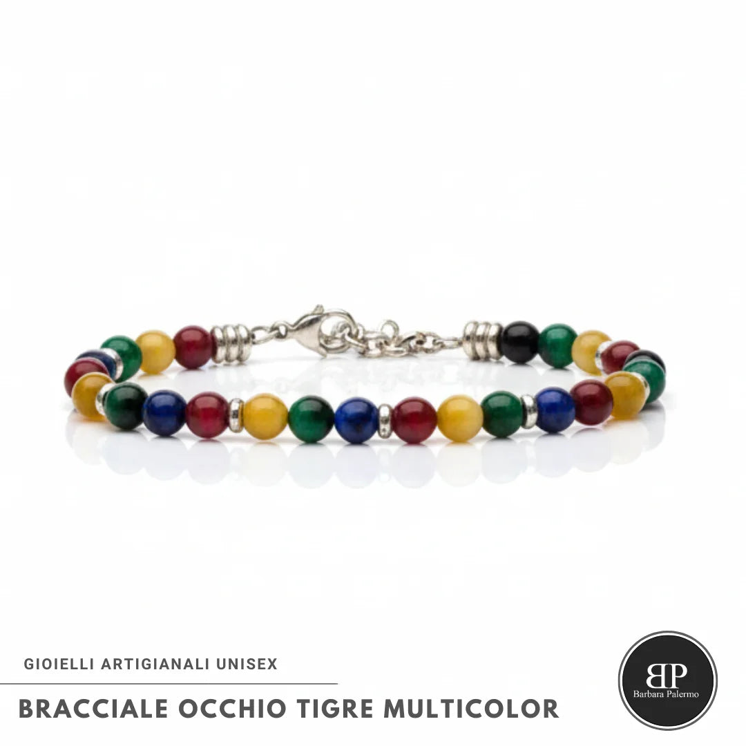 Ein Armband voller Energie und Lebendigkeit: das Multicolor Tigerauge Armband wird in Italien handgefertigt mit 6 mm natürlichen Edelsteinen, die in verschiedenen leuchtenden Farbtönen – Rot, Gelb, Grün, Blau und Schwarz – verarbeitet und mit eleganten Rondellen aus 316L Edelstahl kombiniert sind, allergikerfreundlich und rostfrei.