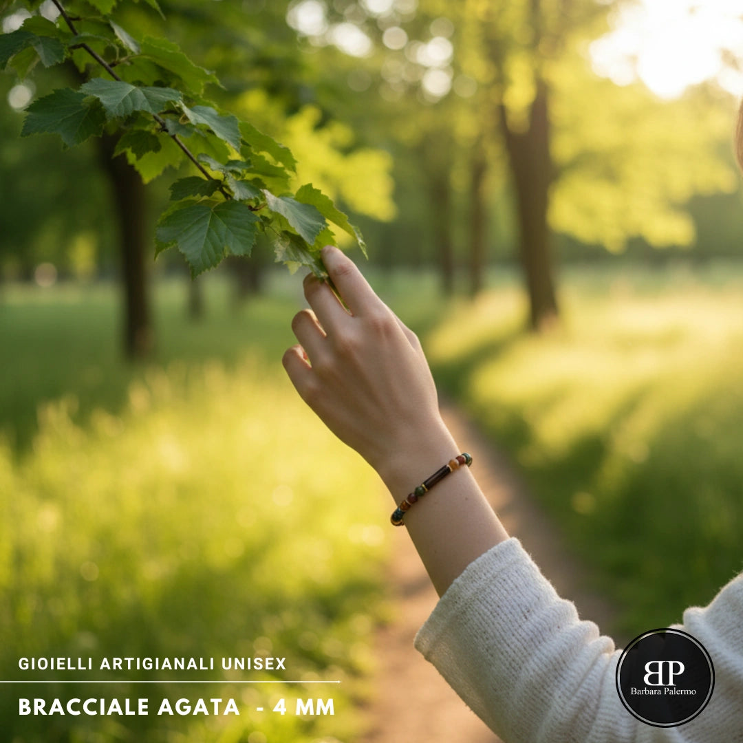 Dieses Halsband wird in Italien handgefertigt und besteht aus 4 mm großen indischen Achat-Edelsteinen und 4 mm großen Achatpastenzylindern und zeichnet sich durch intensive und einzigartige Farbtöne aus.