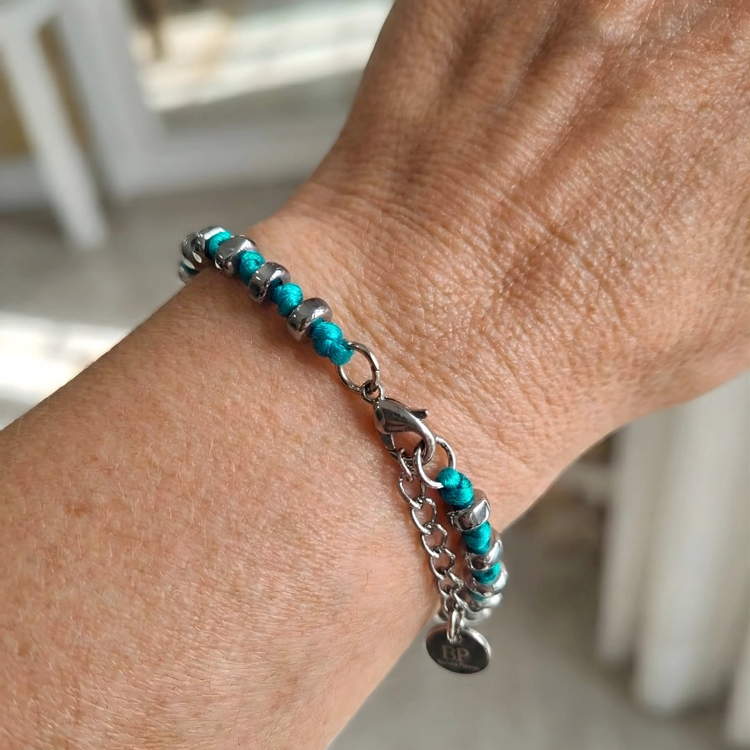 Il Bracciale Luminex Turchese Marino è un gioiello dal carattere fresco e deciso, ispirato ai riflessi del mare e alla forza degli elementi naturali. Il contrasto tra il cordino nautico color turchese marino e i sassolini irregolari di ematite argento a specchio crea un equilibrio perfetto tra energia, eleganza e modernità.