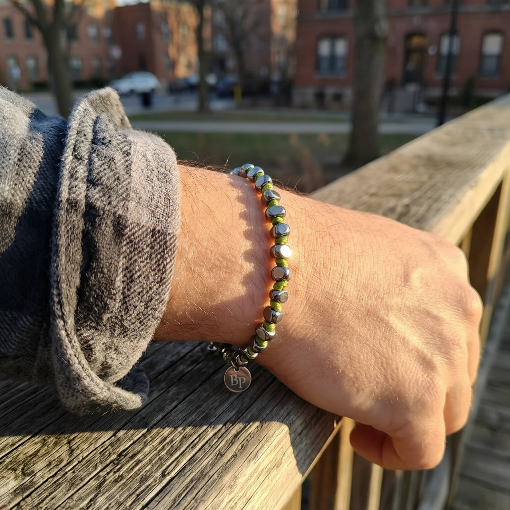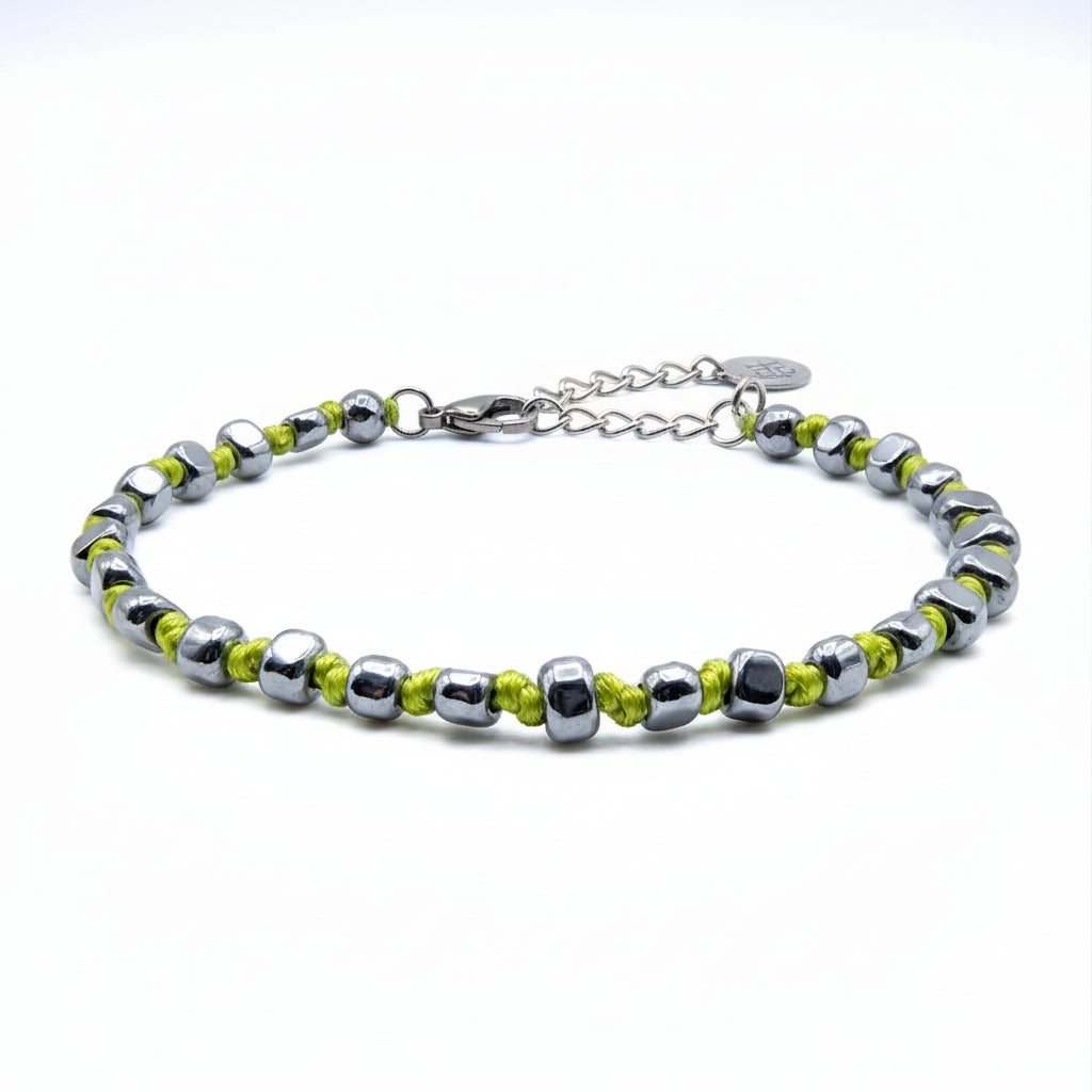 Il Bracciale Luminex Verde Pisello è un gioiello artigianale unisex dal carattere contemporaneo, essenziale e luminoso. La combinazione tra il cordino nautico verde pisello e i sassolini di ematite color argento lucido crea un contrasto raffinato, fresco e versatile, perfetto per l’uso quotidiano.