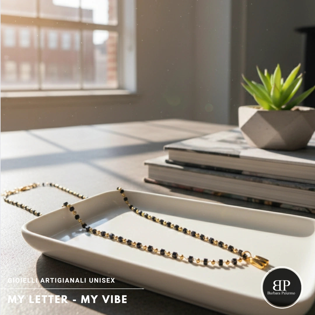 - Cubotti in cristallo nero da 2 mm alternati a sfere dorate da 1,5 mm, per un effetto luminoso ed elegante.