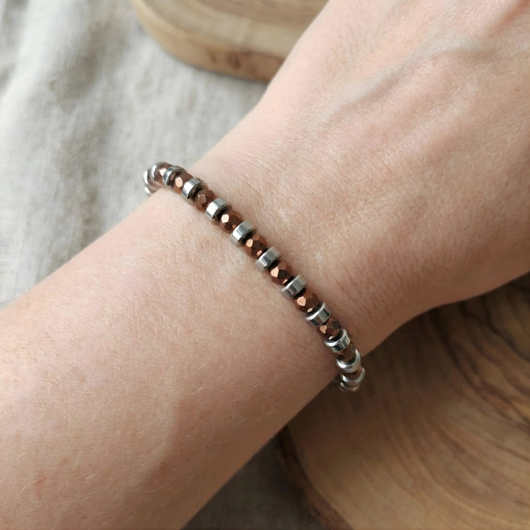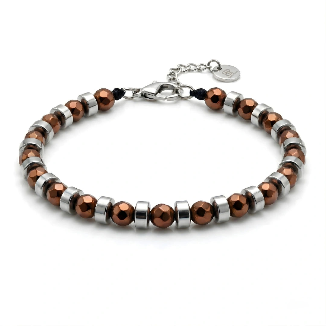 Le rondelle in acciaio inox 316L da 5 mm introducono un contrasto elegante tra la tonalità calda dell’ematite e la brillantezza dell’acciaio, dando vita a un bracciale moderno, equilibrato e versatile.