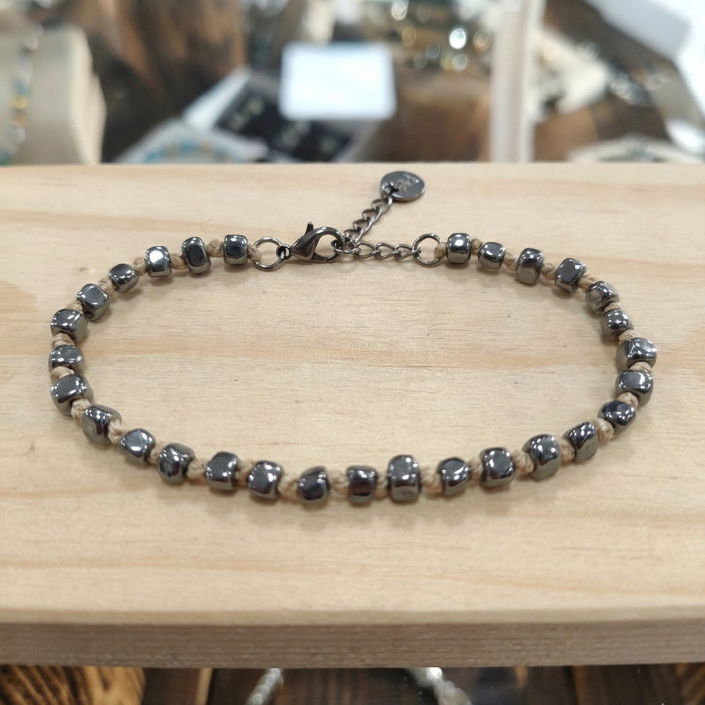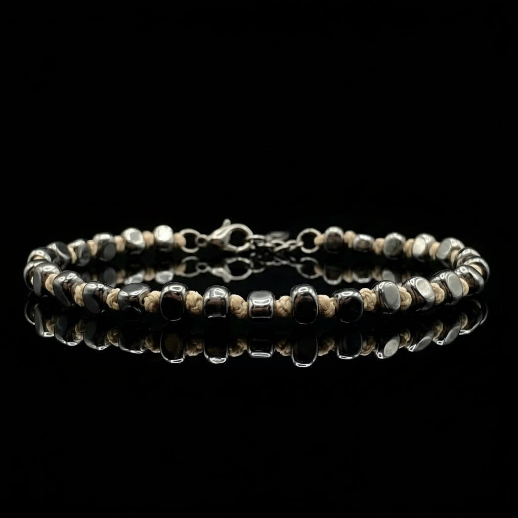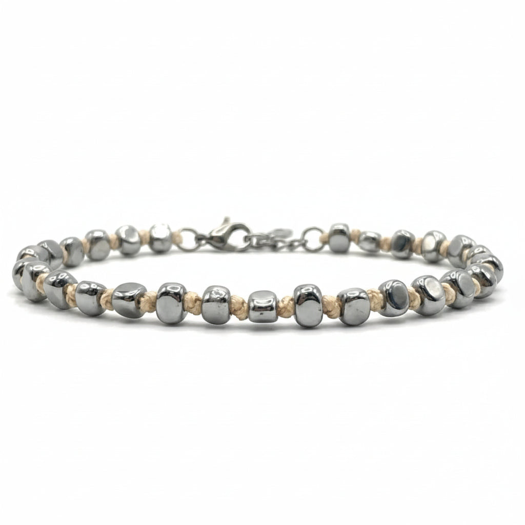 Il cordino nautico color champagne, elegante e neutro, valorizza i sassolini di ematite color argento lucido, creando un contrasto armonioso e contemporaneo. Un bracciale versatile, adatto a ogni stile e facilmente abbinabile ad altri gioielli.