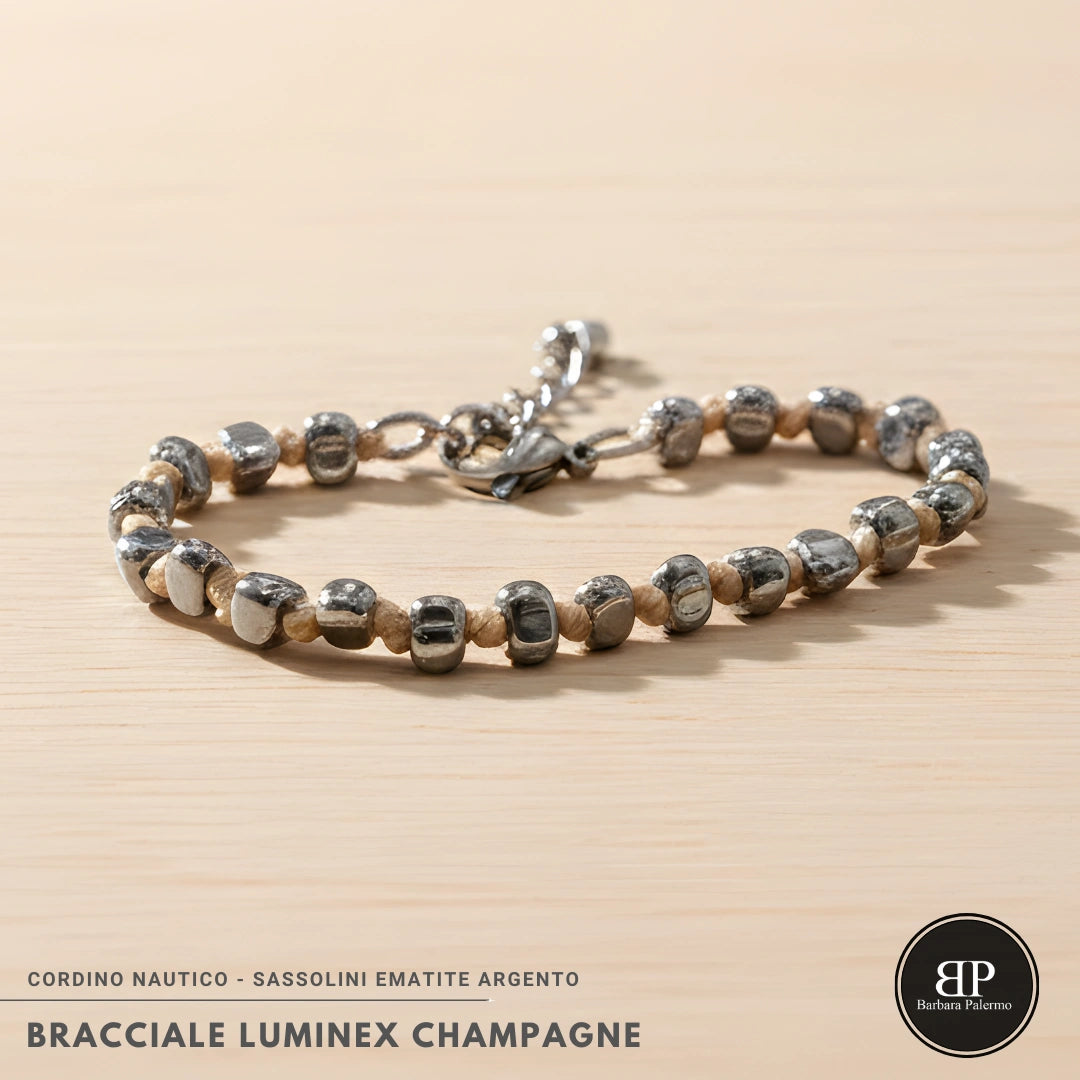 Il Bracciale Luminex Champagne nasce dall’incontro tra materiali tecnici e design artigianale, pensato per chi cerca un gioiello discreto ma di forte personalità, perfetto da indossare ogni giorno.