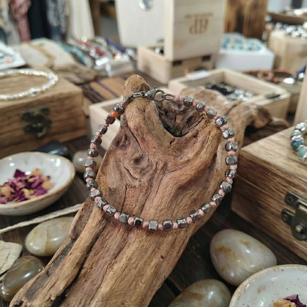 Il cordino nautico rosa, resistente all’acqua e all’usura quotidiana, crea un raffinato contrasto con i sassolini di ematite color argento lucido, che riflettono la luce con eleganza discreta.