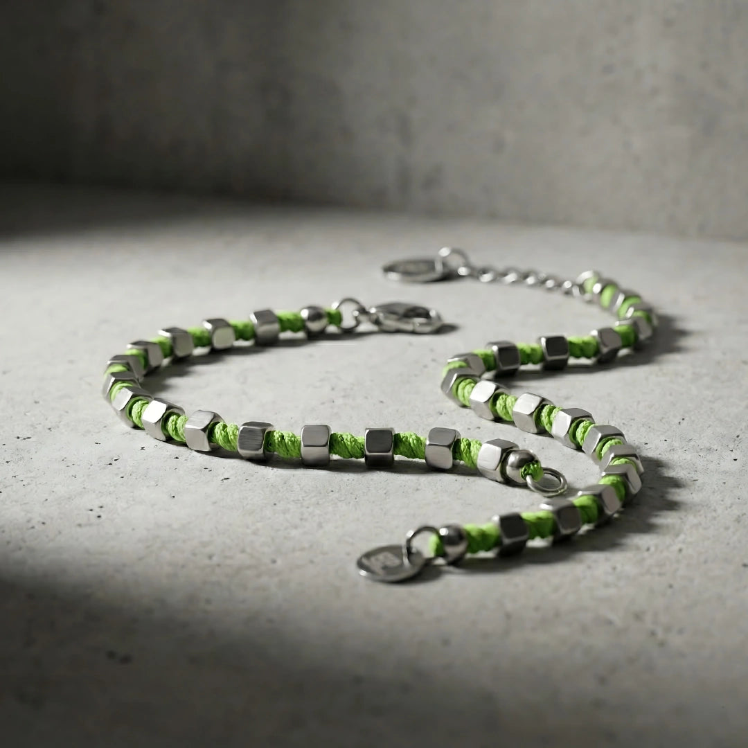 Realizzato con cordino nautico verde chiaro altamente resistente, è impreziosito da cubi in ematite color argento lucido, montati con nodini alternati che garantiscono flessibilità, comfort e durata nel tempo.