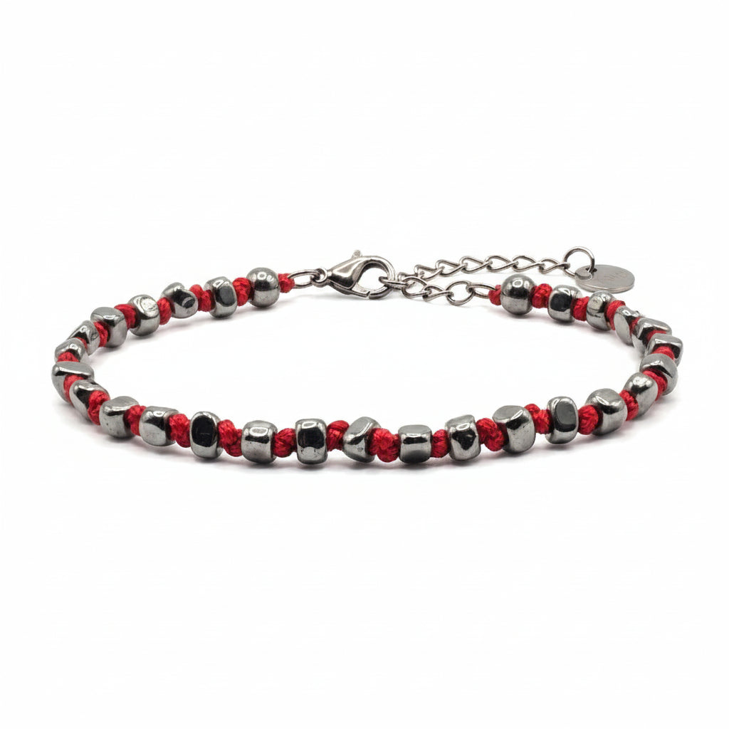 Il colore intenso del cordino nautico rosso crea un contrasto elegante con i sassolini di ematite color argento lucido, dando vita a un design pulito ma di forte personalità.