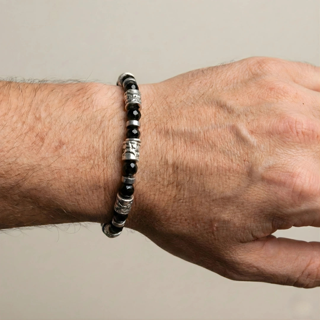 L'Onice nero, la pietra protagonista di questo bracciale, è nota per le sue potenti proprietà. Questa pietra semipreziosa è considerata un forte alleato per il centramento di sé e l'equilibrio emotivo.
