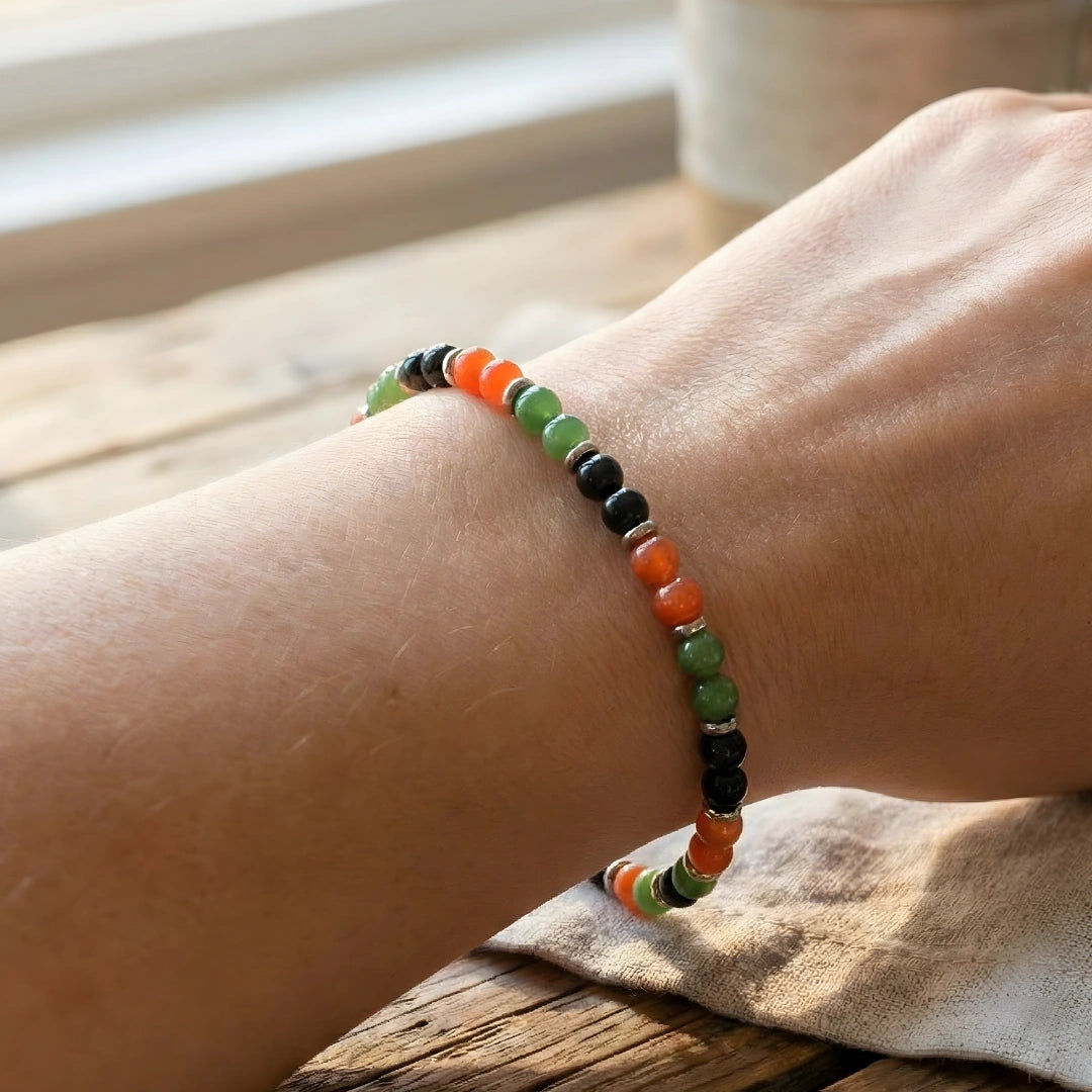 Realizzato con onice nero e vetro nei colori iconici del Venezia – verde, arancione e nero – questo bracciale è dedicato ai tifosi del Venezia Calcio che vogliono indossare con eleganza la propria passione, ogni giorno.