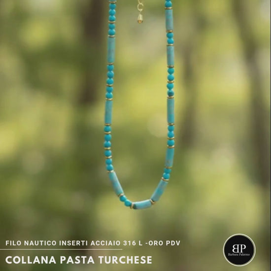 Luce, eleganza e artigianato si incontrano nella Collana Pasta Turchese, un gioiello raffinato che cattura la freschezza del mare e la vivacità del cielo.